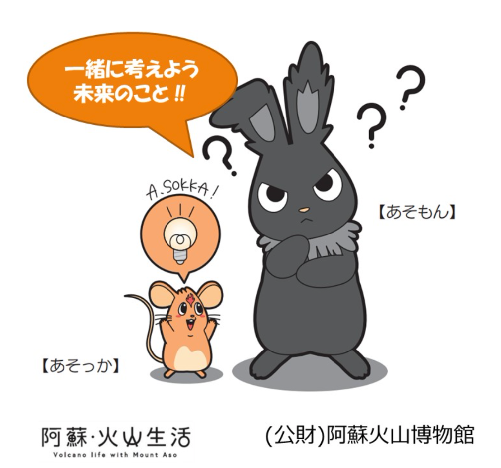 また、当館のキャラクター「あそっか」と「あそもん」は、いずれも阿蘇の草原に生きる動物で「あそっか」はかやねずみ、「あそもん」は野焼きのすすで黒くなった野ウサギをモチーフにしています。