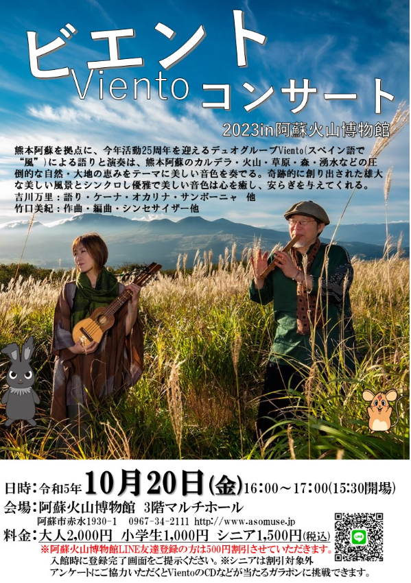 熊本阿蘇を拠点に、今年活動25周年を迎えるディオグループViento(スペイン語で“風”)による語りと演奏は、熊本阿蘇のカルデラ・火山・草原・森・湧水などの圧倒的な自然・大地の恵みをテーマに美しい音色を奏でる。