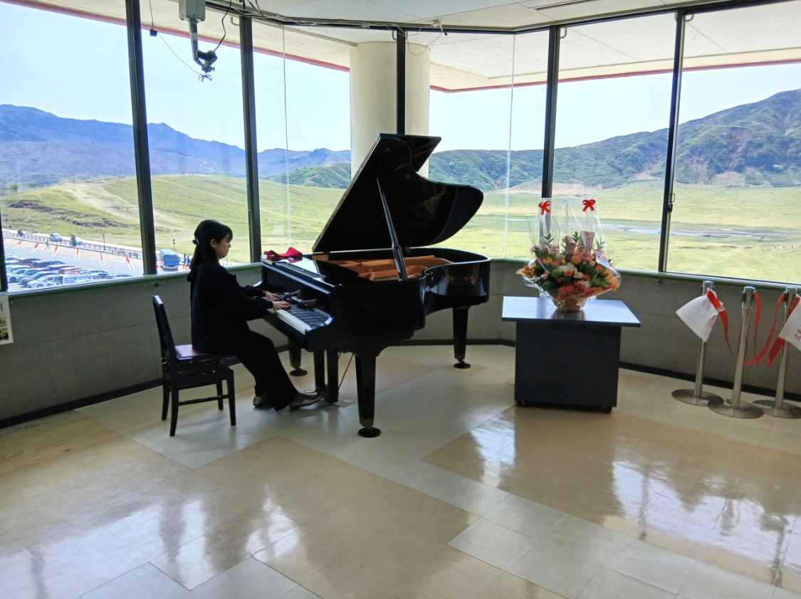 標高1,200mから草千里、中岳を望むロケーションの3階フロアにグランドピアノを設置しました。
