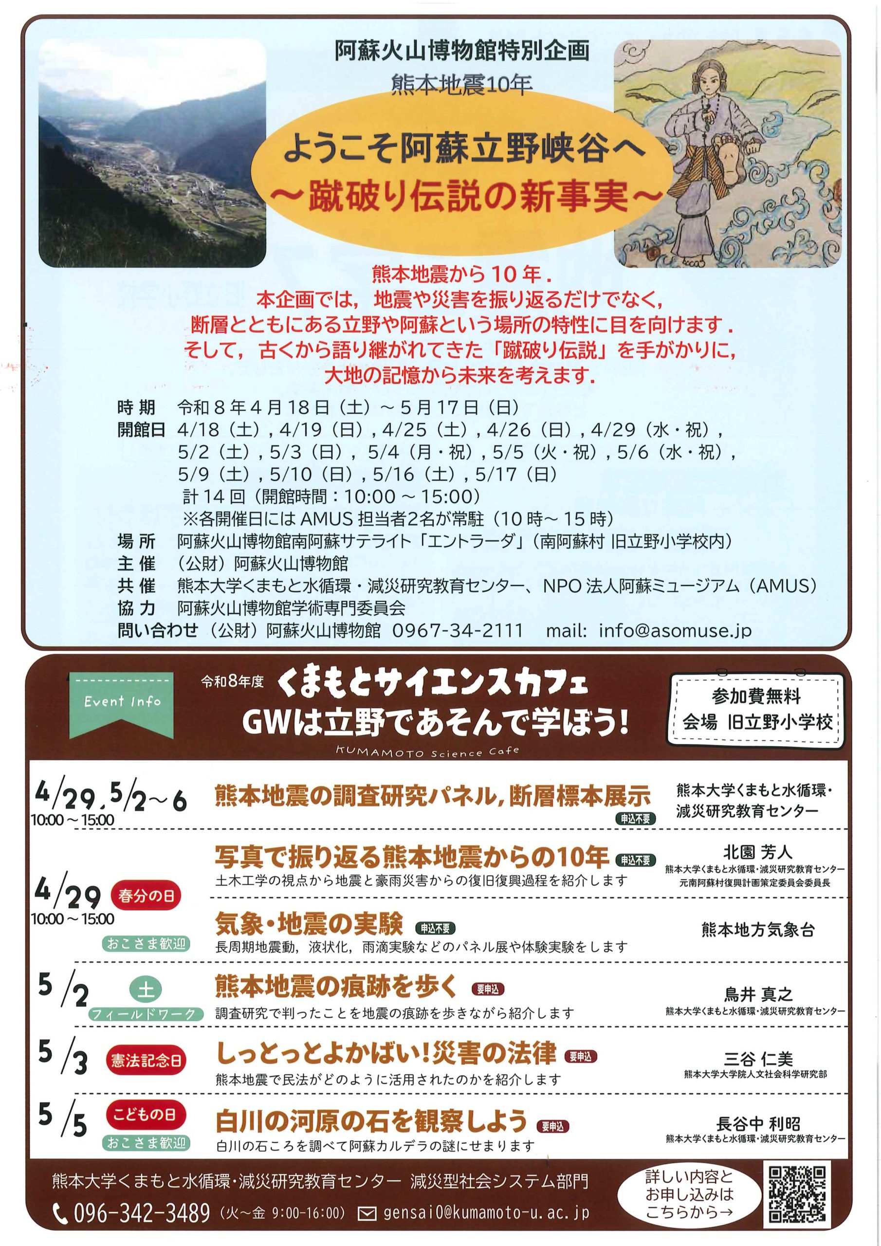 4月18日(土)より阿蘇火山博物館南サテライト「エントラーダ」(旧立野小学校内)にて震災10年特別企画「ようこそ立野渓谷へ~蹴破り伝説の新事実~」を開催します。