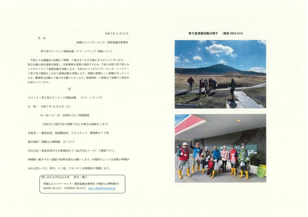 12月6日(土)阿蘇山上ビジターセンターの活動として、草千里ボランティア清掃ツアーを開催します。(昨年12月国立公園90thを記念してスタート今回3回目)