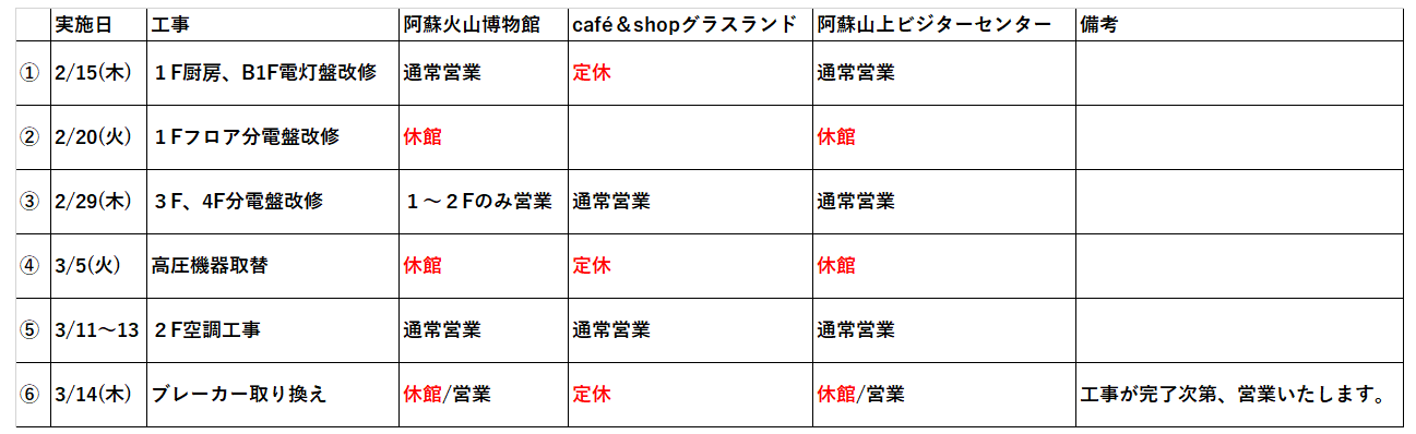 明日は館内1階の電気設備工事の為、阿蘇火山博物館、阿蘇山上ビジターセンター、グラスランドが定休日となります。