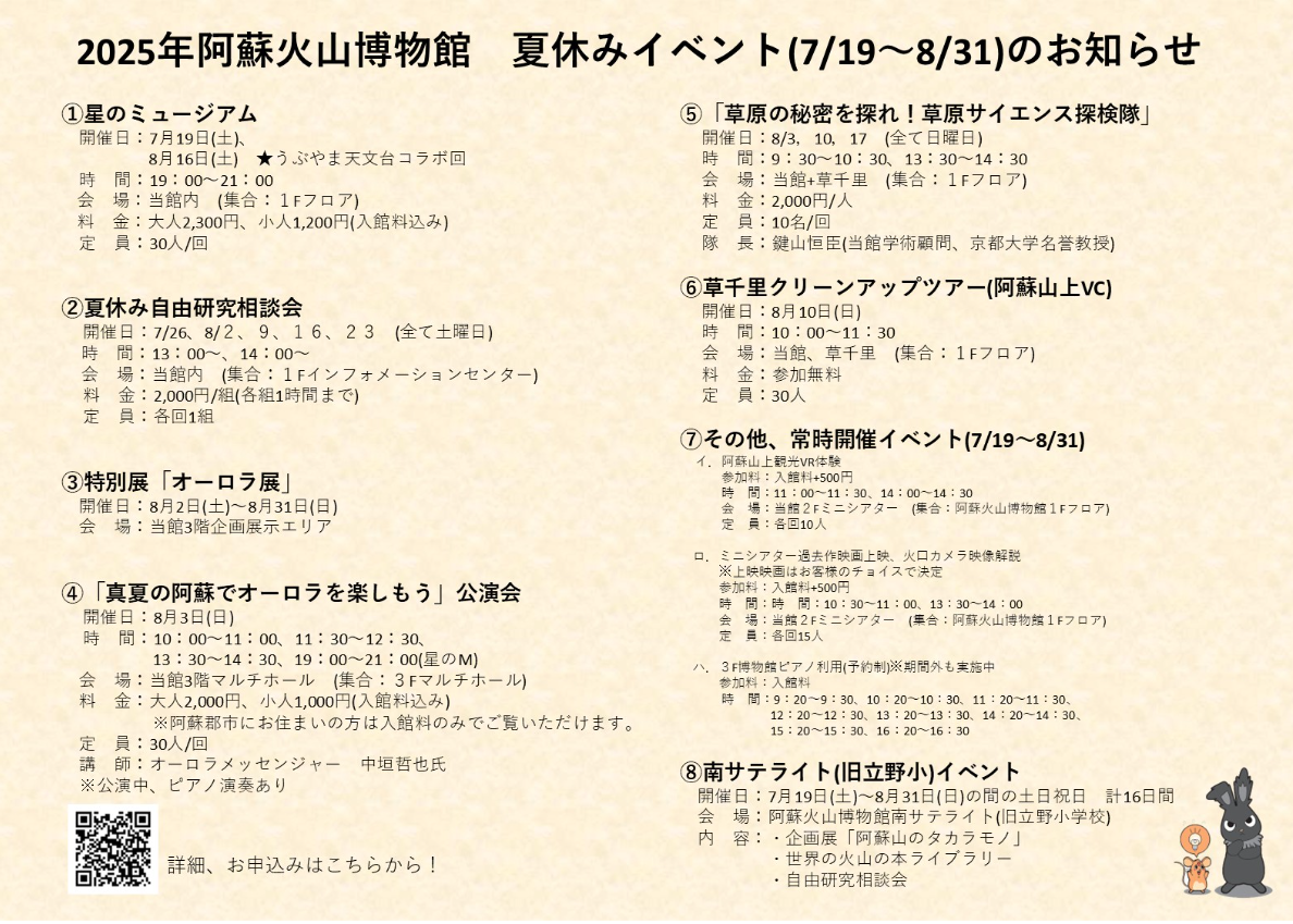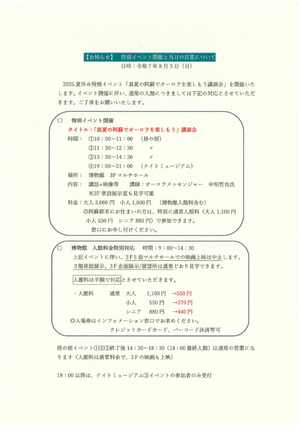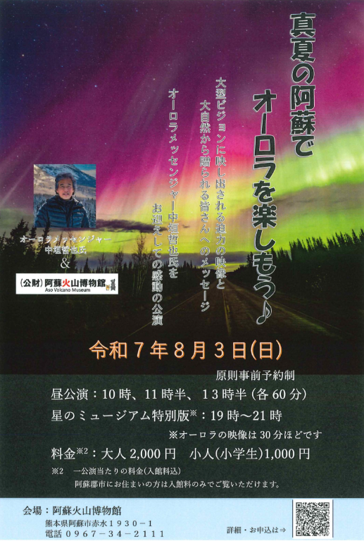 「真夏の阿蘇でオーロラを楽しもう」講演会について、所要時間等の観点から料金を変更させていただきました。