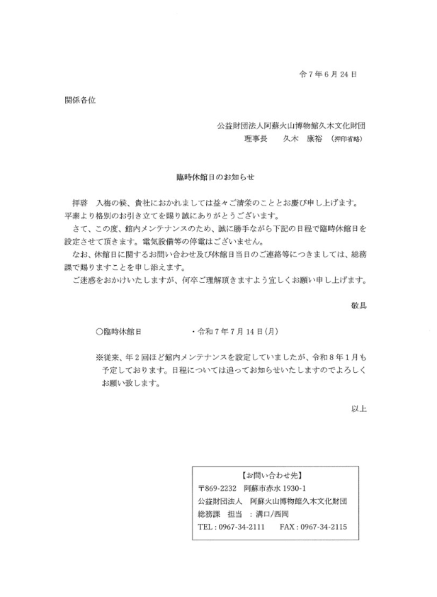 7月14日は館内メンテナンスのため、臨時休館とさせていただきます。