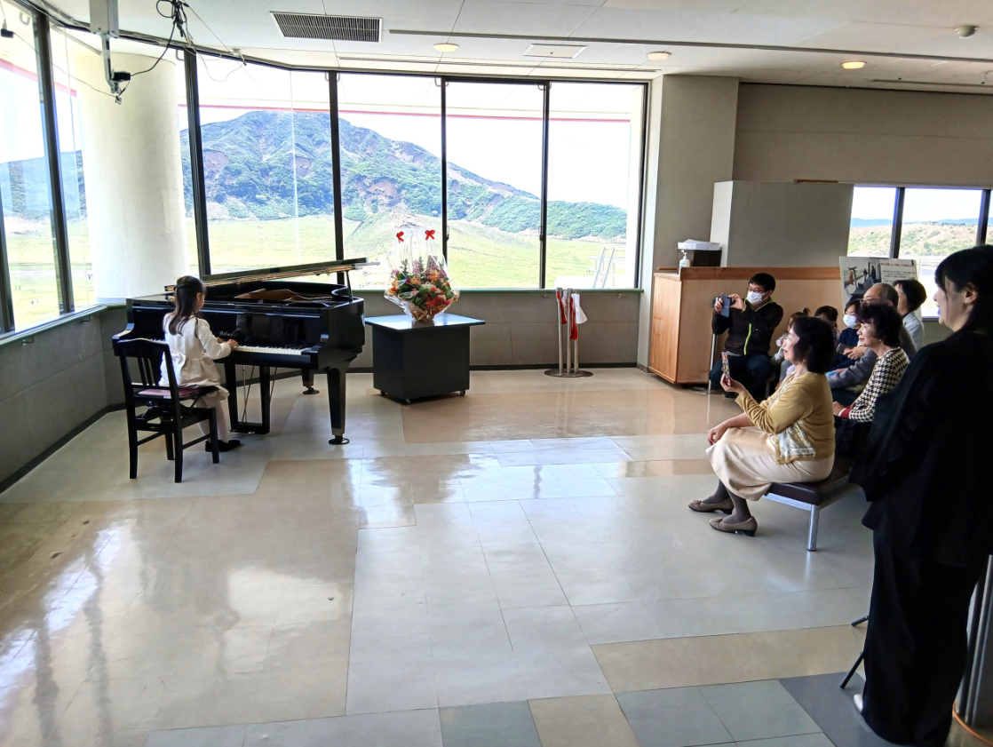 標高1,200mから草千里、中岳を望むロケーションの3階フロアにグランドピアノを設置しました。