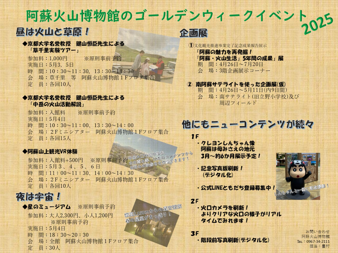 昨年好評だった鍵山先生の草千里実験ツアーやおなじみの星のミュージアムなど、イベントを多数開催いたします。