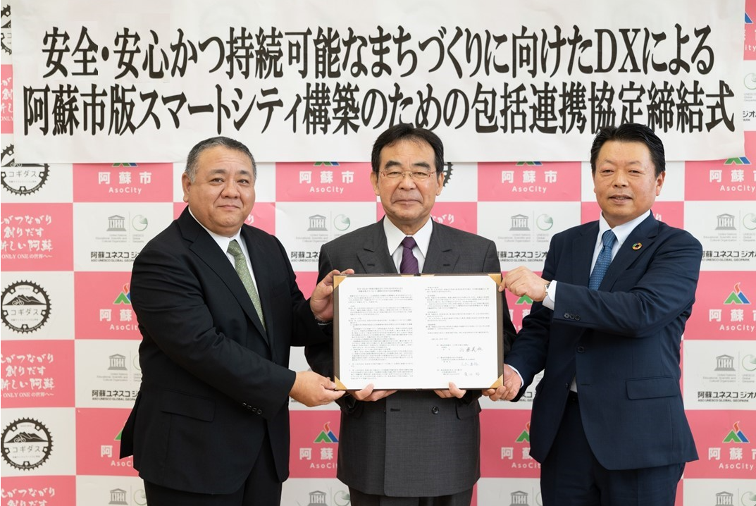 「安全・安心かつ持続可能なまちづくりに向けたDXによる阿蘇市版スマートシティ構築のための包括連携協定」を締結しました。